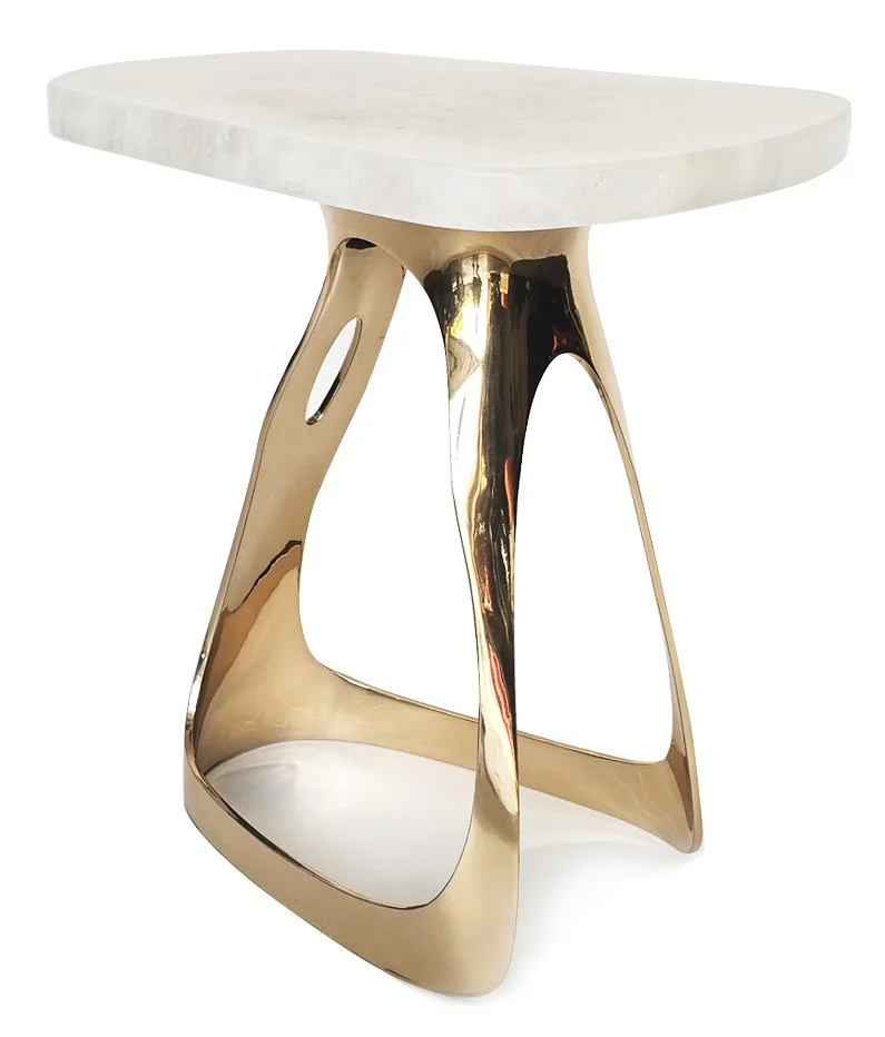 The Bellatrix Bronze Side Table reimagines sculptural elegance through the interplay of light, form, and material. Its fluid, flaring base is cast in highly polished bronze, reflecting its surroundings with a warm, liquid sheen. Rising organically from the ground, the base supports a delicately poised, slim white marble top—its subtle veining offering a serene contrast to the metallic radiance below.